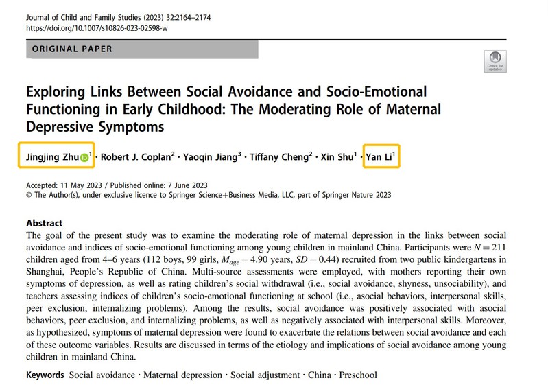Zhu, J., Coplan, R. J., Jiang, Y., Cheng, T., Shu, X., & Li, Y. (2023). Exploring Links Between Social Avoidance and Socio-Emotional Functioning in Early Childhood: The Moderating Role of Maternal Depressive Symptoms. Journal of Child and Family Studies, 1-11.