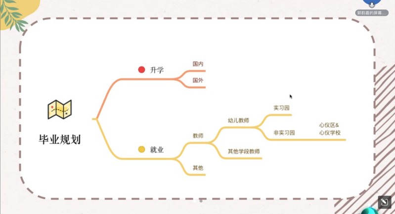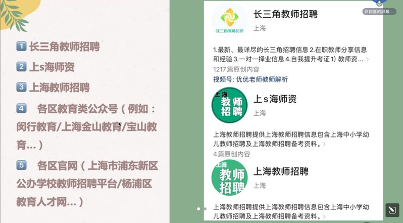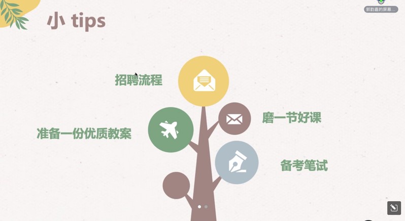 郭韻嘉從“選擇”和“機(jī)會”兩個方面分享幼兒園就業(yè)心得。首先,她強(qiáng)調(diào)求職要明確目標(biāo);其次,她為同學(xué)們推薦了獲取招聘信息的公眾號,如長三角教師招聘、上海教師招聘、SHNU就業(yè)速遞等;最后,郭韻嘉就求職過程中需要注意的細(xì)節(jié)提出了建議,包括招聘流程、準(zhǔn)備一份優(yōu)質(zhì)教案、磨一節(jié)好課、備考筆試四個方面。