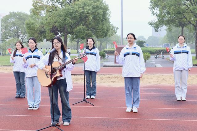 在激昂的國歌聲中,五星紅旗在熠熠晨光中冉冉升起,全體師生肅立注目,表達著對祖國的崇高敬意與深切熱愛。