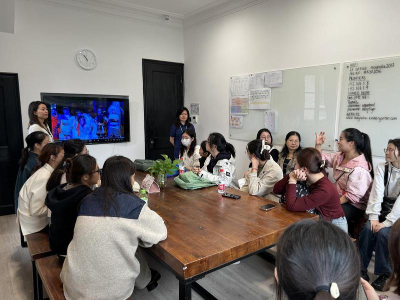 隨后,同學(xué)們分成三組,由幼兒園中、英、法三位教學(xué)主管帶隊(duì)參觀幼兒園各年級(jí)教室、手工室、烘焙室、閱讀室、戶外空間等各個(gè)活動(dòng)區(qū)域,通過各類教學(xué)實(shí)踐活動(dòng)對瑪諾利婭幼兒園的“6H”辦學(xué)理念有了更深入的了解,并真實(shí)地感受到了瑪諾利婭幼兒園溫馨的工作環(huán)境和活躍的課堂氛圍。