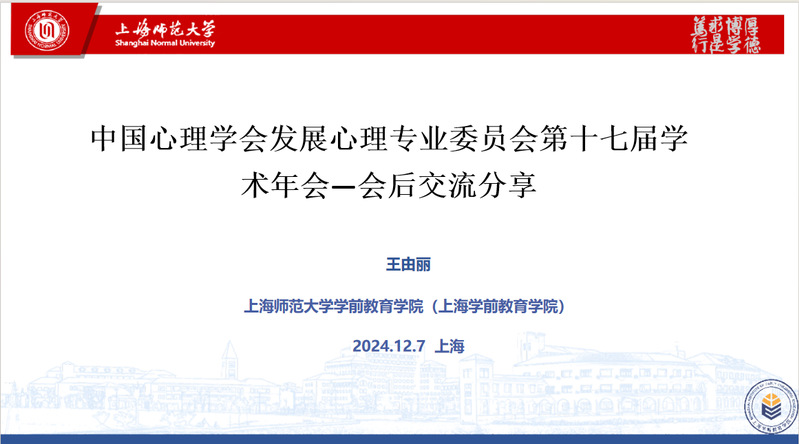 學(xué)院師生到達(dá)杭師大后參加了3個(gè)會(huì)前工作坊,聽(tīng)取了13場(chǎng)大會(huì)報(bào)告。孫娟娟老師擔(dān)任《多孩家庭父母養(yǎng)育、同胞關(guān)系與兒童心理健康》專題報(bào)告的主持人,并做了題為《消極情緒性對(duì)幼兒孤獨(dú)感的影響:獨(dú)處偏好的中介和是否獨(dú)生子女的調(diào)節(jié)作用》的匯報(bào)。學(xué)院博碩士學(xué)生作為報(bào)告人在碩博分論壇進(jìn)行匯報(bào)。其中博士生張警輝和碩士生張晴分別做了題為《母親教養(yǎng)壓力、母子關(guān)系與學(xué)前兒童問(wèn)題性媒介使用的發(fā)展級(jí)聯(lián)效應(yīng):一項(xiàng)縱向研究》《父母手機(jī)成癮、低頭行為與學(xué)前兒童問(wèn)題性媒介使用:一項(xiàng)縱向研究》的匯報(bào);博士生王由麗做了題為《父子關(guān)系與師幼關(guān)系對(duì)兒童心理健康的雙重保護(hù):基于多項(xiàng)式曲面擬合技術(shù)》的匯報(bào);博士生曹思敏、潘寶城做了題為《家庭社會(huì)經(jīng)濟(jì)地位對(duì)幼兒早期數(shù)字素養(yǎng)發(fā)展的影響機(jī)制》《父母童年無(wú)效家庭經(jīng)歷、協(xié)同教養(yǎng)和兒童問(wèn)題行為的關(guān)系:基于共同命運(yùn)中介混合模型》的匯報(bào)。