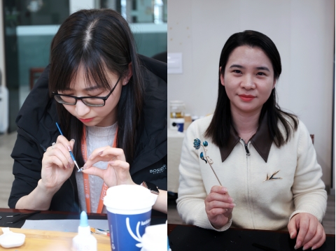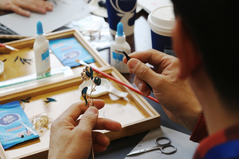 活動(dòng)由學(xué)院工會(huì)精心策劃,將國(guó)家級(jí)非遺點(diǎn)翠工藝轉(zhuǎn)化為沉浸式文化課堂。為踐行生態(tài)理念,染色鵝毛與素雅絲帛替代傳統(tǒng)翠羽,既保留了點(diǎn)翠獨(dú)有的東方色譜,更彰顯師者群體的環(huán)保擔(dān)當(dāng)。老鳳祥非遺傳承人親臨傳授技藝,從剪裁、鑲嵌等技法,指導(dǎo)女教工制作點(diǎn)翠胸針、耳環(huán)、發(fā)簪等飾品?,F(xiàn)場(chǎng)氛圍熱烈而專注,有的老師巧手翻飛,將片片“翠羽”綴成流光溢彩的胸針;有的老師精益求精,笑稱“慢工出細(xì)活,明日再續(xù)匠心”。作品或精致或質(zhì)樸,皆承載著女性對(duì)美的追求與對(duì)文化的敬意?;顒?dòng)現(xiàn)場(chǎng)特設(shè)茶歇交流區(qū),女教工們品茶暢談,分享教學(xué)心得與生活趣事。