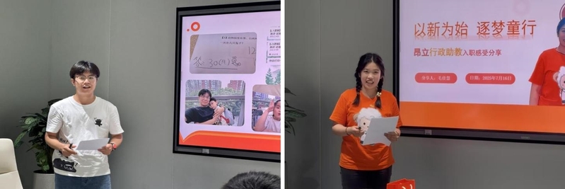 隨后,學生代表陳俊瑋、毛佳慧進行了實踐分享。他們在昂立接觸了不同年齡段的學生,不僅豐富了教學經驗,拓展了職業(yè)視野,更鍛煉了差異化教學設計和課堂管理能力,對教育行業(yè)的多元發(fā)展路徑有了更清晰的認識,也堅定了投身教育事業(yè)的信心。