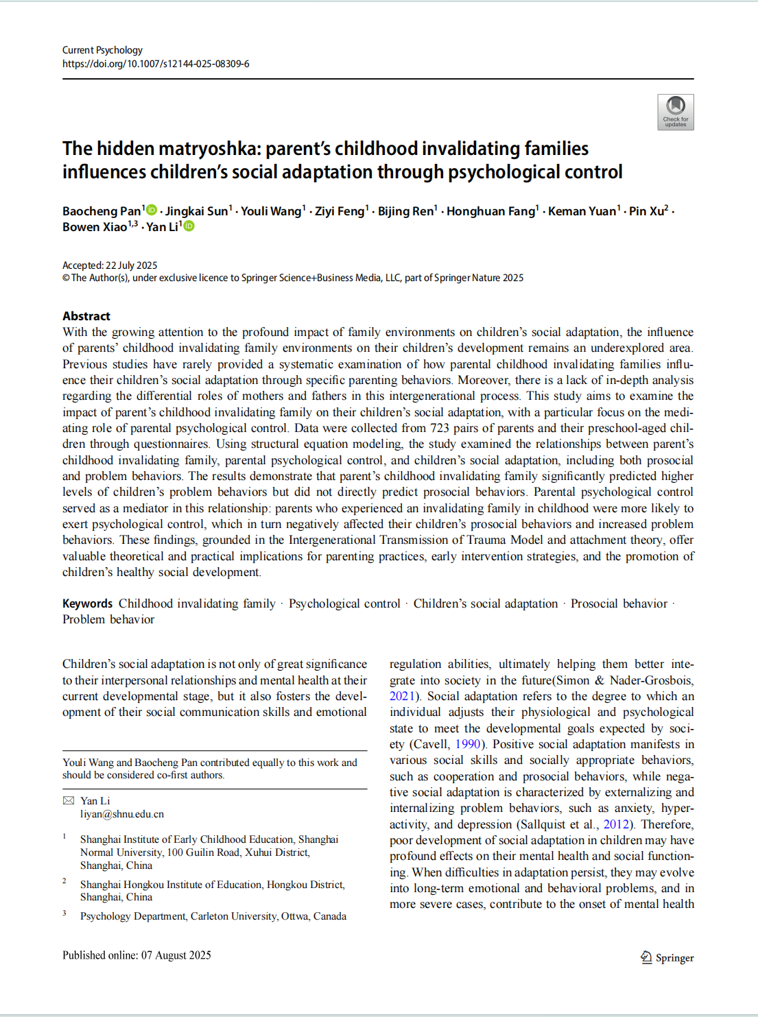 Pan, B., Sun, J., Wang, Y. et al. The hidden matryoshka: parent’s childhood invalidating families influences children’s social adaptation through psychological control. Curr Psychol (2025). https://doi.org/10.1007/s12144-025-08309-6