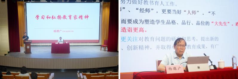 贈(zèng)書儀式后,楊德廣教授作“學(xué)習(xí)和弘揚(yáng)教育家精神”專題講座。他從教育家精神的概念入題,指出教育家既要當(dāng)好“句讀之師”“經(jīng)師”,更要當(dāng)好“人師”,不能只做傳播書本知識(shí)的教書匠,要成為塑造學(xué)生品格、品行、品位的“大先生”。