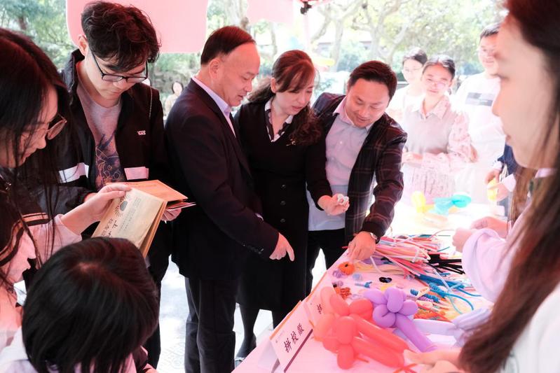 隨著返校人流增多,迎來校友打卡集章高潮。面對(duì)前來參與的校友,志愿者們熱情接待,耐心講解并引導(dǎo)校友們“拼?;?、扎氣球、扭彩棒”。