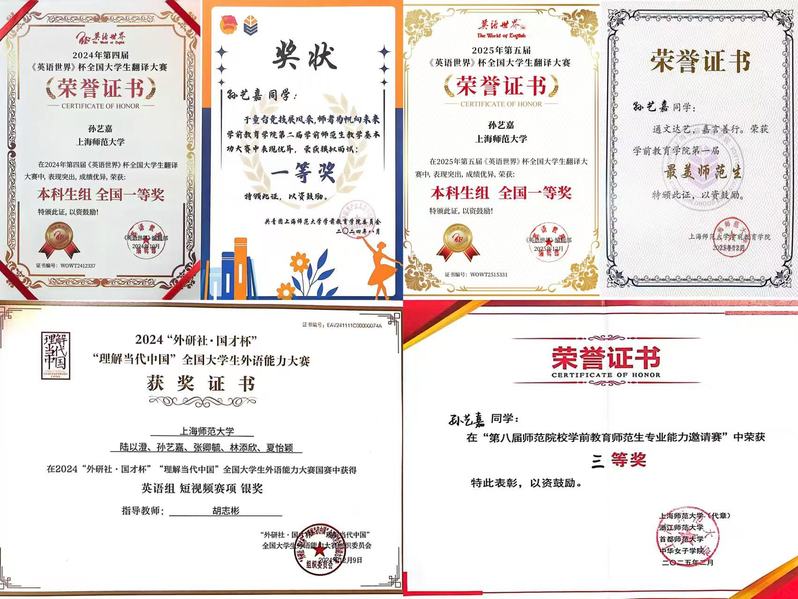 征途漫漫,學(xué)海無(wú)涯,她選擇輔修英語(yǔ)專(zhuān)業(yè)以提升自己的綜合實(shí)力,也在各類(lèi)競(jìng)賽中屢創(chuàng)佳績(jī),連續(xù)兩年在《英語(yǔ)世界》杯翻譯大賽中斬獲全國(guó)一等獎(jiǎng),在2024年“外研社·國(guó)才杯”全國(guó)大學(xué)生外語(yǔ)能力大賽中摘得國(guó)賽銀獎(jiǎng),在2025年全國(guó)高校商業(yè)精英挑戰(zhàn)賽中奪得國(guó)賽二等獎(jiǎng),努力成長(zhǎng)為一名具備跨學(xué)科學(xué)習(xí)與應(yīng)用能力的優(yōu)秀教師。