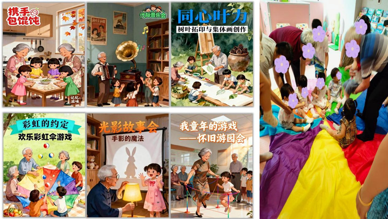 為破解“空間相鄰但服務(wù)分離”的困局,團(tuán)隊聯(lián)合街道開展多場“祖孫同樂”實踐活動。在專業(yè)教師帶領(lǐng)下,老人帶著孫輩共同參與手工、故事等互動。王爺爺欣喜地說:“活動要多辦!孩子有伴,我們也開心,感覺自己變年輕了。”現(xiàn)場的歡聲笑語,成為“老幼共托”理念最溫暖的詮釋。