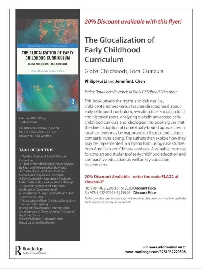 近日,我院李輝院長(zhǎng)與知名學(xué)前教育專家Jennifer J. Chen強(qiáng)強(qiáng)聯(lián)合出版的最新書籍《The Glocalization of Early Childhood Curriculum》(《幼兒課程的全球本地化》)由Routledge正式出版發(fā)行。本書通過(guò)實(shí)證和理論研究,探討了幼兒課程的爭(zhēng)論(例如,“以兒童為中心”與“教師主導(dǎo)”),揭示了它們獨(dú)特的社會(huì)、文化和歷史根源。本書分析了全球倡導(dǎo)的幼兒課程和意識(shí)形態(tài),如發(fā)展適宜性教育實(shí)踐、以兒童為中心的方法、建構(gòu)主義和全球化的童年,認(rèn)為如果缺乏對(duì)當(dāng)?shù)?/span>社會(huì)和文化的關(guān)照,而將其生硬“移植”是不合適的。此外,作者提出了如何以混合形式實(shí)施幼兒課程。本書以中國(guó)大陸、香港特別行政區(qū)和美國(guó)的案例研究為特色,為后真相時(shí)代幼兒課程研究和實(shí)踐的未來(lái)發(fā)展和重新部署提供了見(jiàn)解和建議。