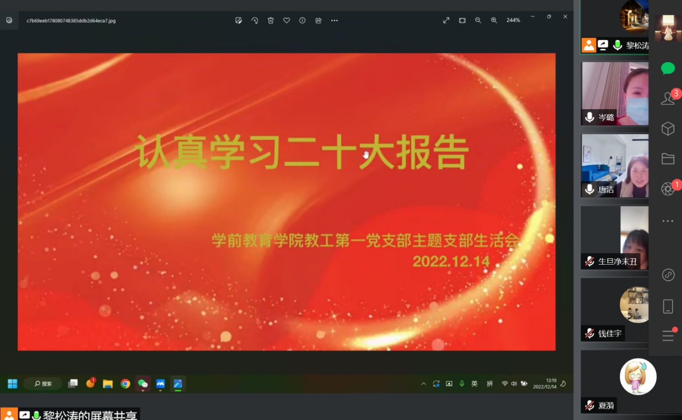 2022年12月14日,kaiyun體育登錄網(wǎng)頁(yè)入口教工第一黨支部在騰訊會(huì)議上展開了主題黨日活動(dòng)。這次會(huì)議由支部書記黎松濤老師主持,主要學(xué)習(xí)了《黨的二十大報(bào)告》。