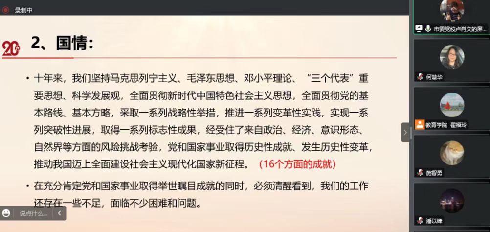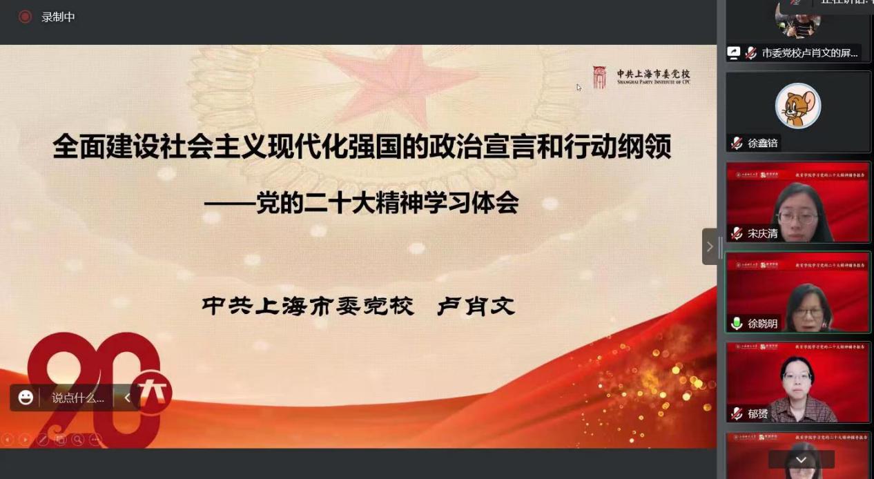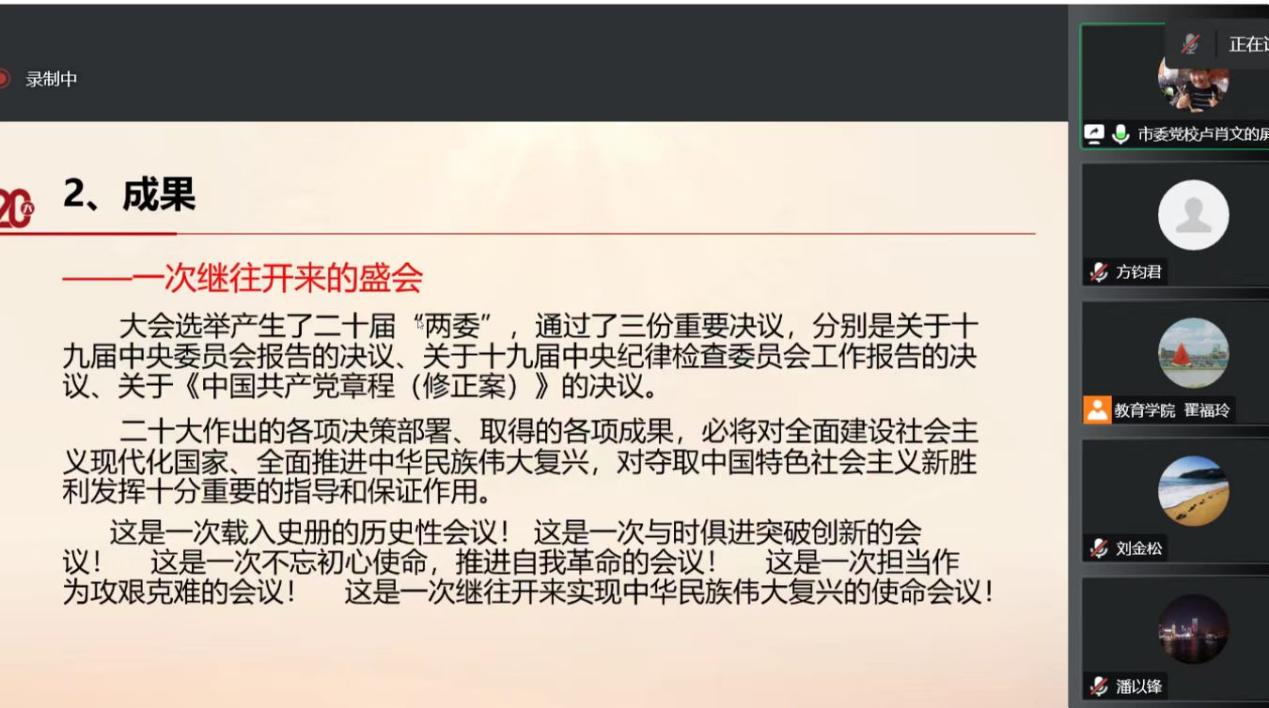 8位黨員同志積極認(rèn)真地學(xué)習(xí)盧肖文教授的報(bào)告。盧教授深入地為大家解讀了黨的二十大報(bào)告。黨的二十大報(bào)告首先回顧了黨的奮斗歷史以及作出瞻望未來(lái)的宣示。十年來(lái),中國(guó)共產(chǎn)黨經(jīng)歷了三件大事:迎來(lái)中國(guó)共產(chǎn)黨成立一百周年,中國(guó)特色社會(huì)主義進(jìn)入新時(shí)代,完成脫貧攻堅(jiān)、全面建成小康社會(huì)的歷史任務(wù),實(shí)現(xiàn)第一個(gè)百年奮斗目標(biāo)。十年來(lái),我們堅(jiān)持馬克思列寧主義、毛澤東思想、鄧小平理論、“三個(gè)代表”重要思想、科學(xué)發(fā)展觀,全面貫徹習(xí)近平新時(shí)代中國(guó)特色社會(huì)主義思想,全面貫徹黨的基本路線、基本方略,采取一系列戰(zhàn)略性舉措,推進(jìn)一系列變革性實(shí)踐,實(shí)現(xiàn)一系列突破性進(jìn)展,取得一系列標(biāo)志性成果,經(jīng)受住了來(lái)自政治、經(jīng)濟(jì)、意識(shí)形態(tài)、自然界等方面的風(fēng)險(xiǎn)挑戰(zhàn),黨和國(guó)家事業(yè)取得了歷史性成就,發(fā)生歷史性變革,推動(dòng)我國(guó)邁上全面建設(shè)社會(huì)主義現(xiàn)代化國(guó)家新征程。在充分肯定黨和國(guó)家事業(yè)取得舉世矚目成就的同時(shí),必須清醒看到,我們的工作還存在一些不足,面臨不少困難和問(wèn)題。在此背景下,為了中華民族偉大復(fù)興,我們要牢記五個(gè)必由之路:堅(jiān)持黨的全面領(lǐng)導(dǎo)是堅(jiān)持和發(fā)展中國(guó)特色社會(huì)主義的必由之路,中國(guó)特色社會(huì)主義是實(shí)現(xiàn)中華民族偉大復(fù)興的必由之路,團(tuán)結(jié)奮斗是中國(guó)人民創(chuàng)造歷史偉業(yè)的必由之路,貫徹新發(fā)展理念是新時(shí)代我國(guó)發(fā)展壯大的必由之路,全面從嚴(yán)治黨是黨永葆生機(jī)活力、走好新的趕考之路的必由之路。