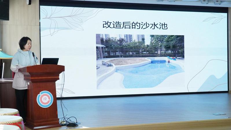 隨后,大班教研組組長顧黎航老師以《“瓶”安起航——幼兒沙水游戲中的探索與成長》為題,詳細闡述了教師如何巧妙地利用不同材質的“瓶子”作為開放性材料,引導幼兒在自主游戲中進行感知、操作、探索與創(chuàng)造。從最初的隨意堆砌,到有目的的搭建船只,顧老師生動地展示了幼兒在沙水游戲中如何學習數(shù)學、科學、語言、社會等多領域知識,如何發(fā)展動手能力、思維能力、合作能力與問題解決能力,以及教師如何通過細致的觀察、適時的介入和有效的支持。