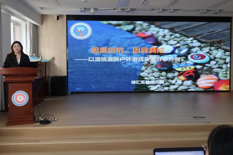 徐匯實驗幼兒園黨支部書記、園長李菁以《因差創(chuàng)機,因異共成——以混班混齡戶外游戲交流分享為例》為題,結合幼兒園長期開展的混班混齡戶外游戲實踐,深入剖析了其中蘊含的豐富教育契機。她談到混齡環(huán)境為不同發(fā)展水平的幼兒提供發(fā)展平臺,大孩子可以在幫助小孩子的過程中鞏固知識、提升領導力,小孩子則可以在模仿和跟隨中獲得榜樣力量和安全感。李菁還通過多個具體案例,展示了教師如何敏銳地捕捉到幼兒在游戲中因個體差異而產(chǎn)生的各種問題、沖突與需求,并巧妙地將其轉化為促進全體幼兒共同學習與成長的寶貴教育契機。