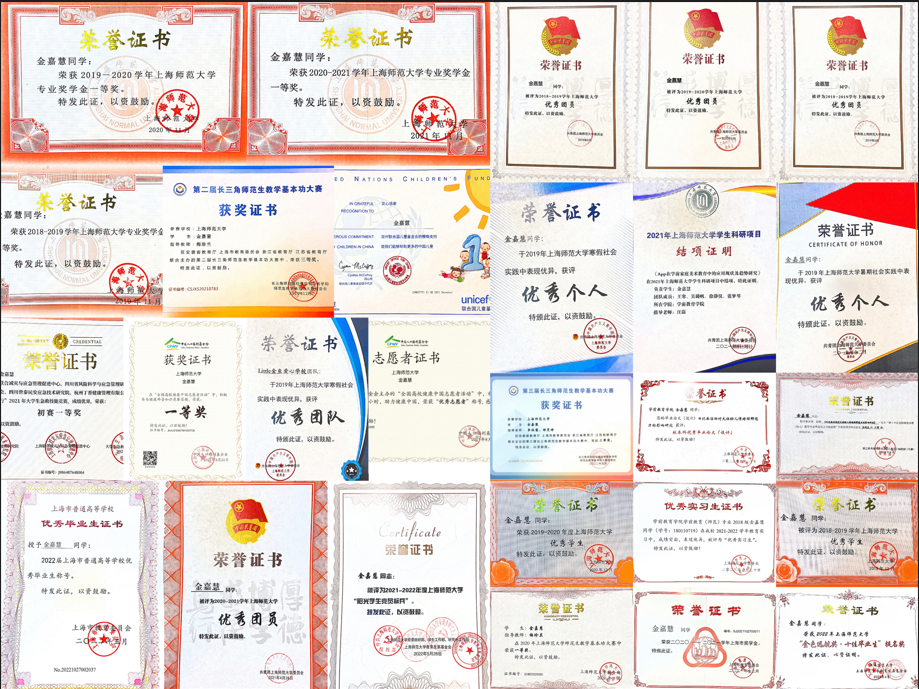 學(xué)高為師,身正為范,身在學(xué)前教育專業(yè)的金嘉慧深深知道,教師承載著接續(xù)奮斗的使命,亦肩負(fù)著立德樹人的擔(dān)當(dāng)。為此她勤勉自勵(lì),力求成為理論功底扎實(shí),專業(yè)技能突出的師范生,不僅多次被評(píng)為專業(yè)一等獎(jiǎng)學(xué)金,先后5次在長(zhǎng)三角及上海市師范生技能大賽中斬獲各類獎(jiǎng)項(xiàng),更獲得上海市獎(jiǎng)學(xué)金,上海市優(yōu)秀畢業(yè)生,十佳畢業(yè)生提名等榮譽(yù),并以院系排名第一獲得研究生推免資格。