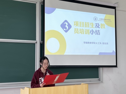 隨后院紅蘋果慈善義工隊(duì)教學(xué)部部長張安琪回顧項(xiàng)目招生及教員培訓(xùn)工作。同時(shí)對于教員提出期望,希望教員能在項(xiàng)目教學(xué)實(shí)踐中認(rèn)真打磨教學(xué)大綱,靈活選擇教學(xué)方法,充分明確教學(xué)目標(biāo),動態(tài)關(guān)注學(xué)生反饋,以堅(jiān)定的理想信念、高尚的道德情操,扎實(shí)的理論功底投入到項(xiàng)目后續(xù)的教學(xué)實(shí)踐過程中。